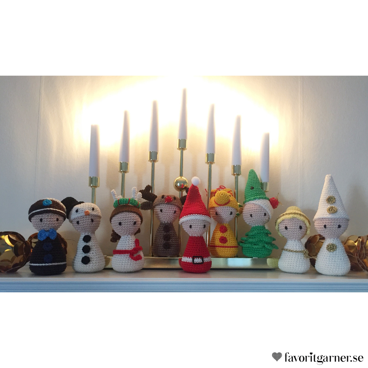 GARN & TILLBEHÖR – I garnpaketet ingår förutom 14 nystan bomullsgarn även vårt nya glittergarn i guld och/eller silver (25-gramsnystan – säljs ej separat). I ordinarie mönster används inte glittergarnet jättemycket men vi tipsar i mönstret när detta kan läggas till för att göra figurerna ännu juligare. Det blir en hel del bomullsgarn då färgerna är många och figurerna små men om du köper till vitt och hudfärg så kan du virka fler figurer. Det ingår även en vit och röd mini-pompom (1 cm) till renen och jultomten, en maskmarkör i metall som behövs till mönstret och en smaskig tomteklubba (ni minns väl klassikern från förr?).