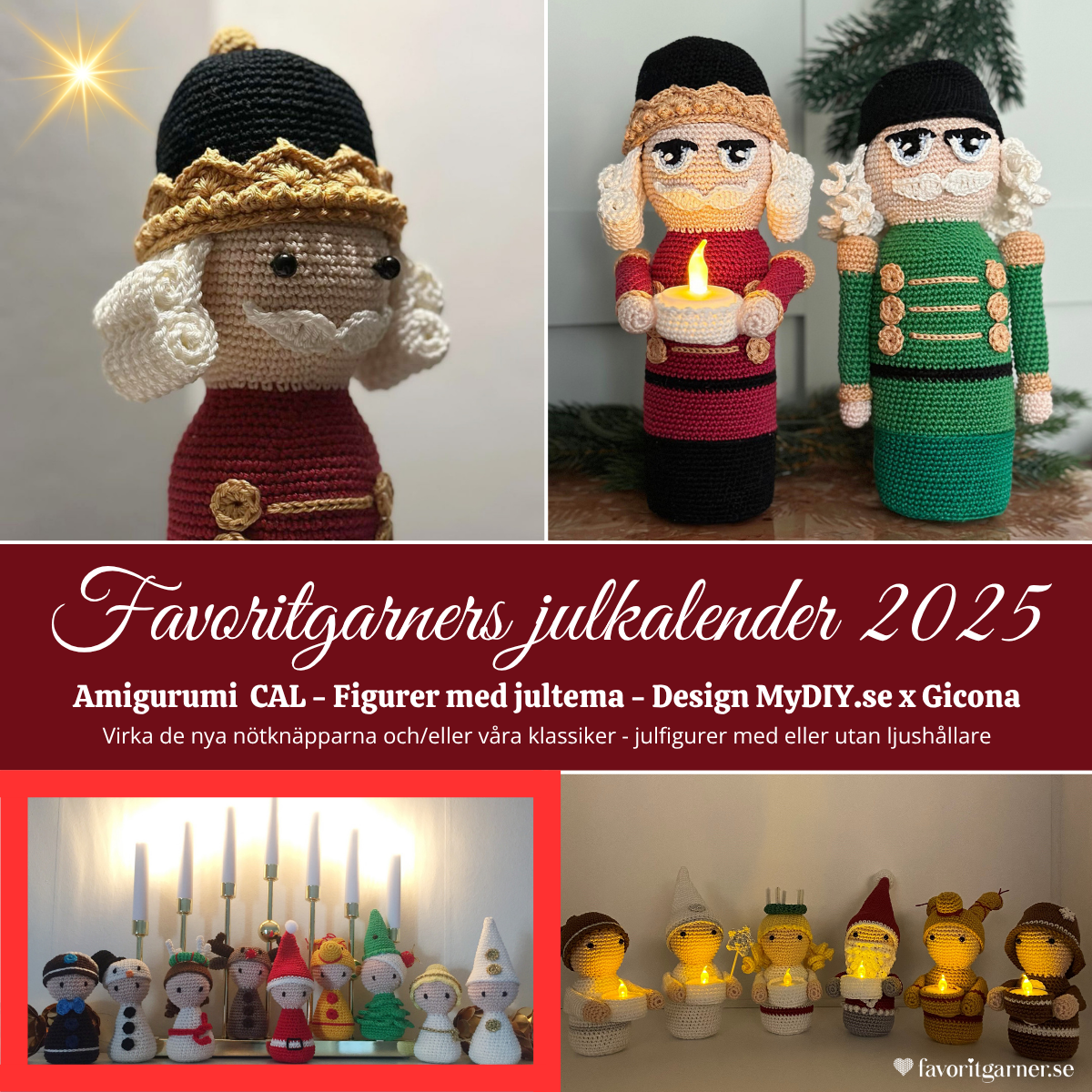 Garnpaket till virk-julkalender 2025 – Favoritgarners julkalender består i år av tre olika mönster och du kan virka ett, två eller alla tre. Vi ska virka amigurumis! Vi lär ut grunden till hur man virkar figurer och ger er våra bästa tips och trix. Mönstret och instruktionerna till vår Amigurumi-CAL är helt gratis, du betalar endast för materialet.