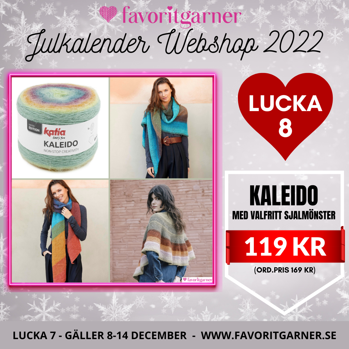 Kaleido är en färgskiftande garnkaka som blir vackert självrandande och skapar snygga stickade och virkade sjalar. Det är ett ”Limited edition” garn vilket betyder att det finns i begränsad upplaga. Alla nystan ser lite olika ut, färgerna är de samma men placeringen av färgpartierna i respektive nystan skiftar.
