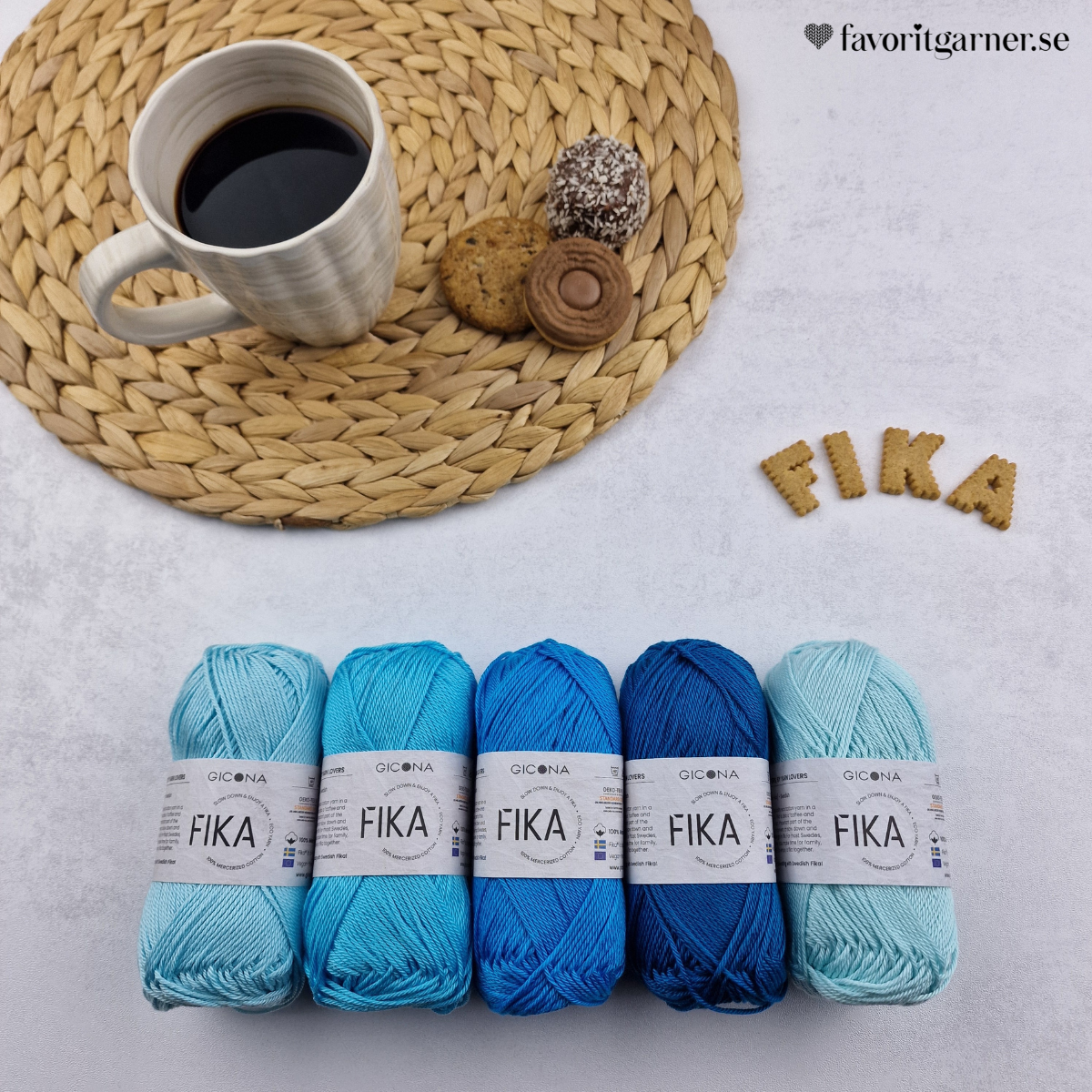 FIKA (Gicona) är vårt eget merceriserade och ekologiska bomullsgarn som finns i hela 136 färger framtagna för den skandinaviska smaken och som tillverkas i Europa med OEKO-TEX® Standard 100, klass 1. Garnet har fin glans och är praktiskt tvättbart i 60 grader. Färgpaketens nyanser passar bra ihop till flerfärgade projekt, tänk bara på att färger uppfattas olika beroende på bildskärm. Garnpaketen är unika för Favoritgarner.